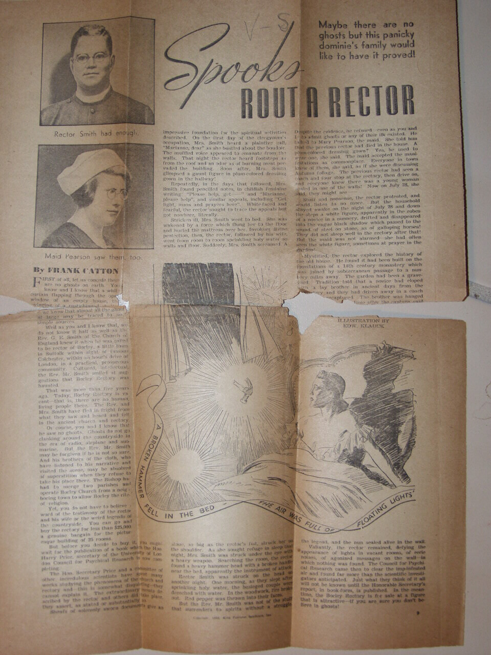 The Hon. Secretary Price and a committee of other incredulous scientists have spent many weeks studying the phenomena of the church and rectory and-this is somewhat diquieting-they cannot explain it. The extraordinary events described by the rector and others did take place, they assert, as sstated or substantially so. Sheafs of solemnly sworn documents give an impressive foundation for the spiritual activities described. On the first day of the clergyman's occupation, Mrs. Smith heard a plaintive call, "Marianne, dear" as she bustled about the boudoir. The muffled voice appeared to emanate from the walls. That night the rector heard footsteps as from the roof and an odor as of burning meat pervaded the building. Soon after, Mrs. Smith glimpsed a gaunt figure in plum-colored dressing gown in the hallway!