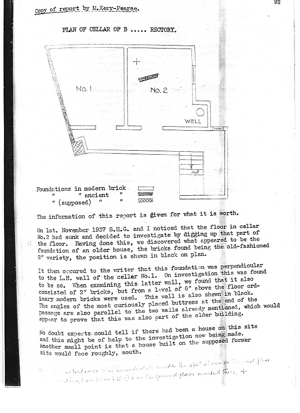 This subsidence was immediately under the spot shown on the first floor landing -see plan 15-C(?) - and on the ground floor marked thus. + [source of this note unknown]
