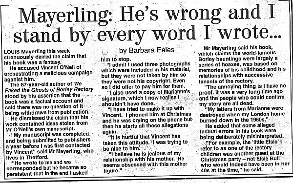 Contrary to [what] Louis Mayerling [says], neither he nor my mother [was] responsible for the alleged hauntings at Borley Rectory. In his new book, [....] .. "How We Faked the Ghosts of Borley Rectory," [Mayerling makes his claims] in great detail - detail that is all imagination.