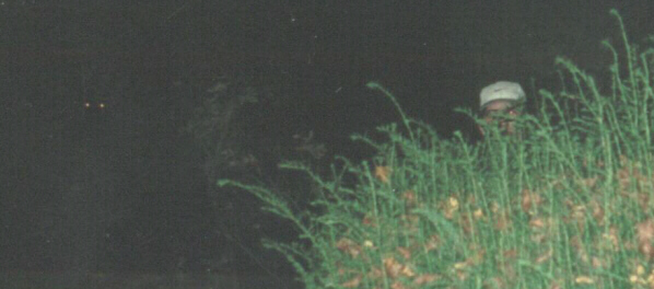 We went to [Borley] on Halloween 2000 because we had seen your site on the Internet. We got very excited about going. When we got there, already quite a few people had shown up. We had a walk around the church a couple of times shining our torches everywhere and taking lots of pictures. While we were there we started to feel that it was a lot of rubbish about the ghosts, so we went home. When I got my pictures developed, I was shocked to see that one of them had some bright red eyes staring out. I know that there was no-one there because when I took the picture, no-one was around. The background behind the picture is that at that stage we had gotten bored so we were larking about a bit. My mate hid behind the yew bush and just poked his head out to try and look a bit scary! I got a bigger scare when I got the photo back! Shaun Copple